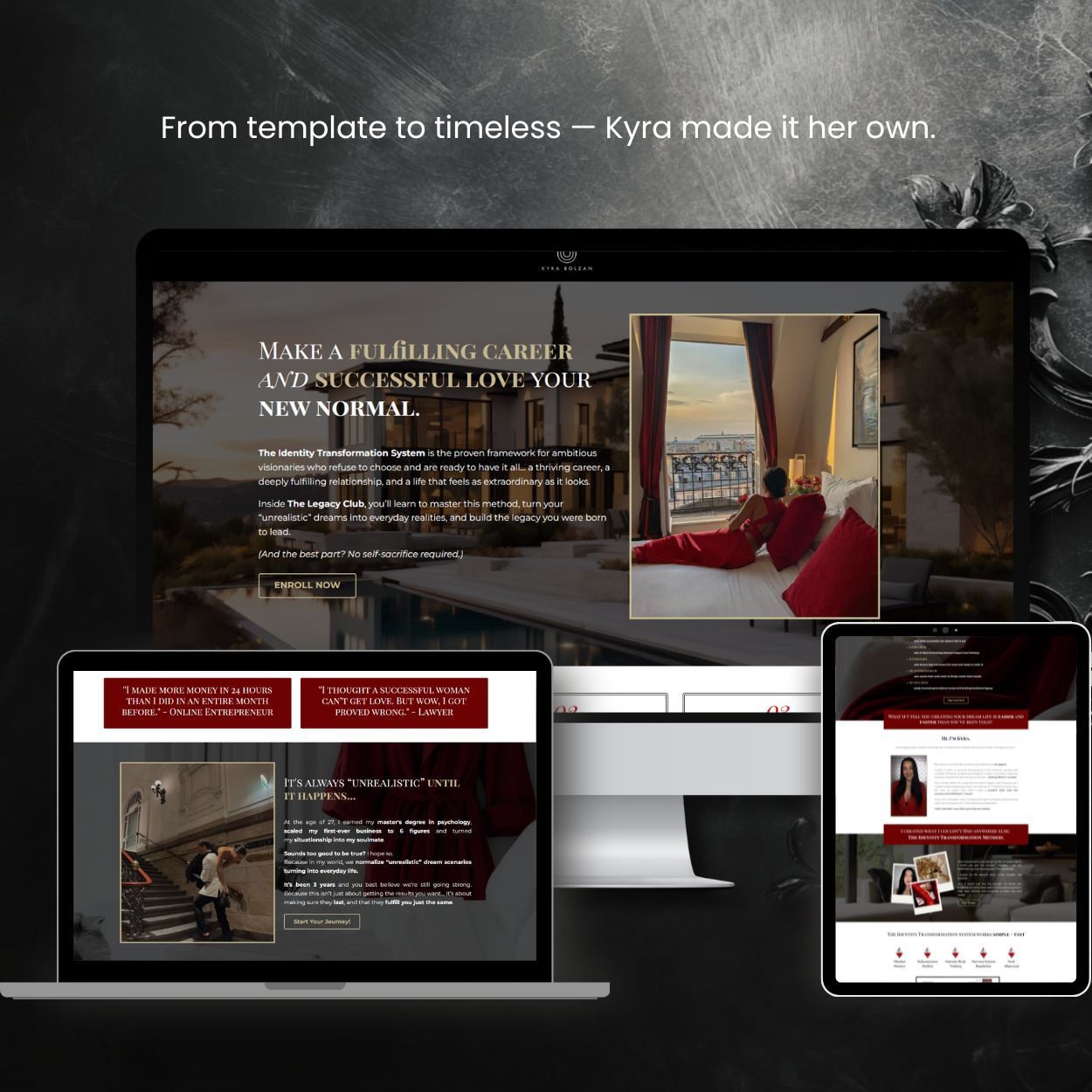 Kyra Bolzan, a psychology expert and identity mentor, needed a digital presence that matched the depth and elegance of her work. Using the Executive Template Bundle, she transformed her Kajabi site, landing pages, and lead magnet into a cohesive, elevated experience that spoke directly to her dream clients.