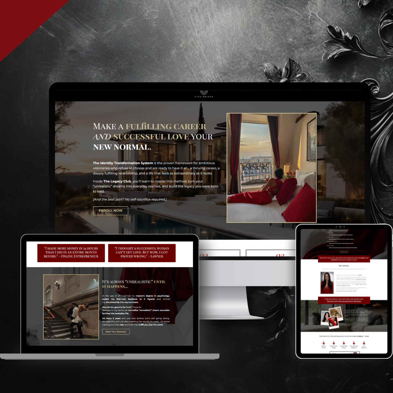 A clean, modern Kajabi website template designed to feel polished, confident, and unmistakably premium. With crisp white space and bold cherry-red accents, Empress creates a powerful first impression that reflects feminine leadership and authority.